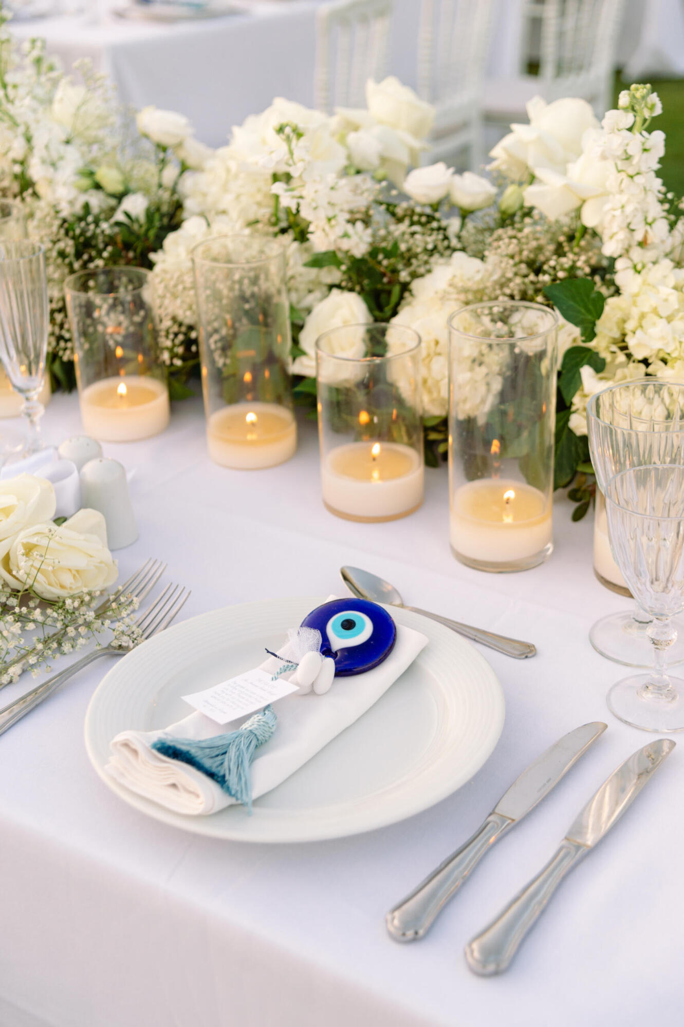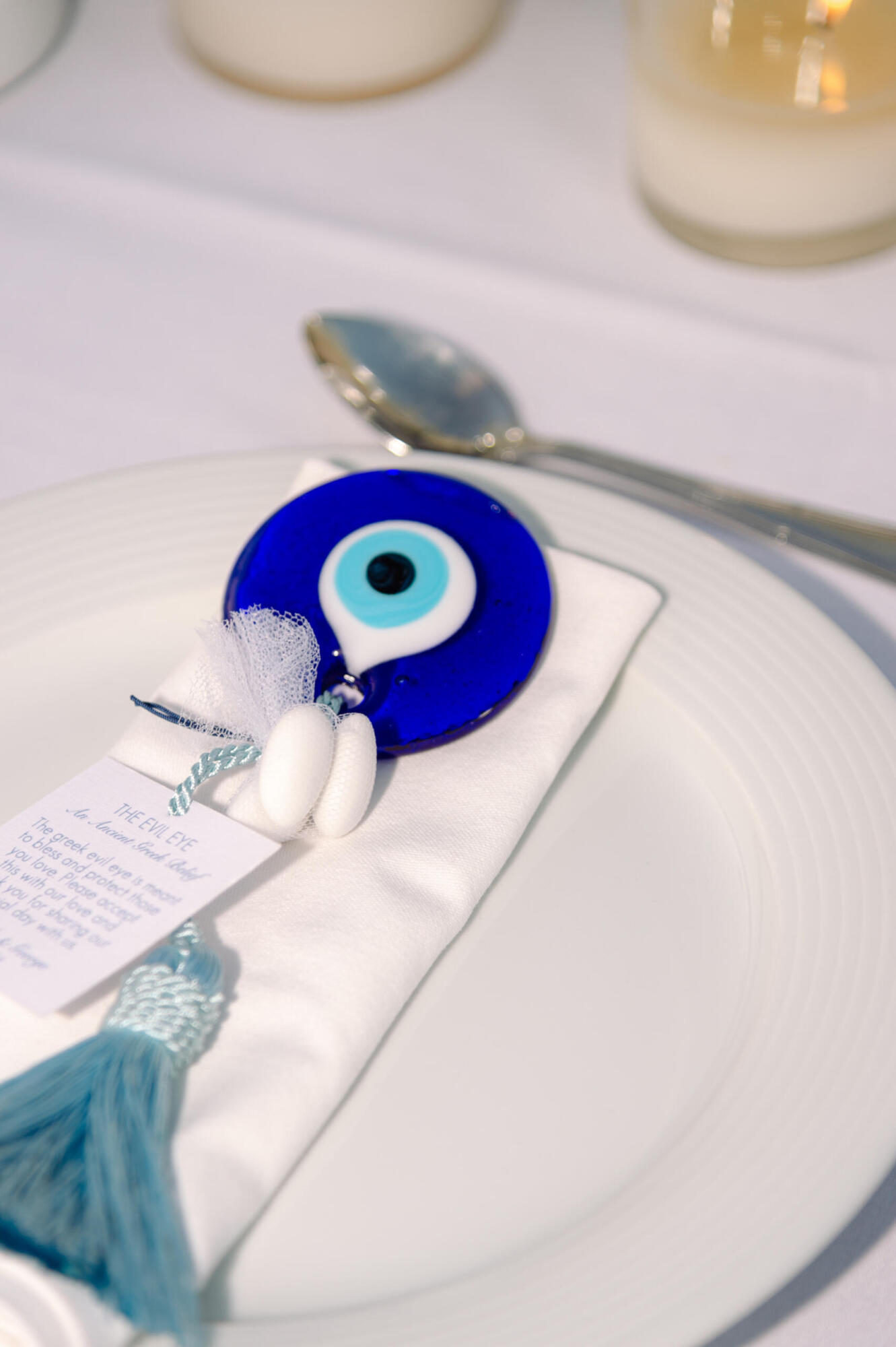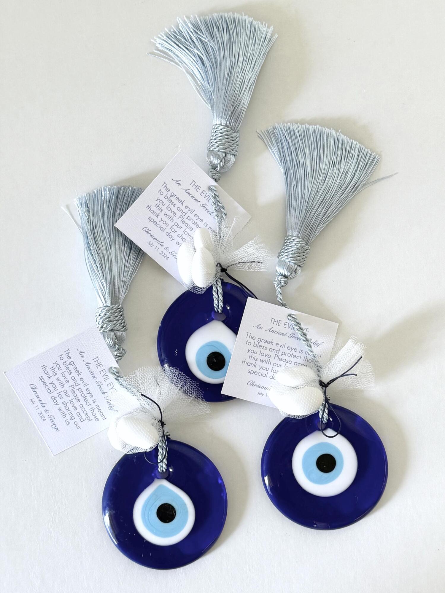 Items featured: Wedding favor and gift (“evil eye” ornament with tassel and a thank you tag)