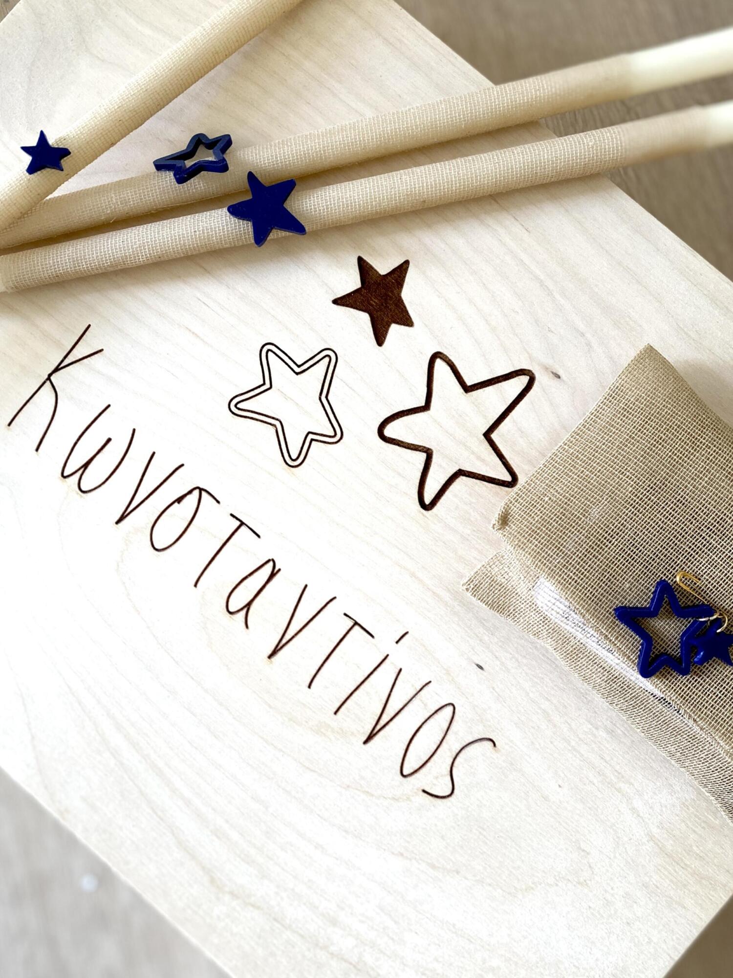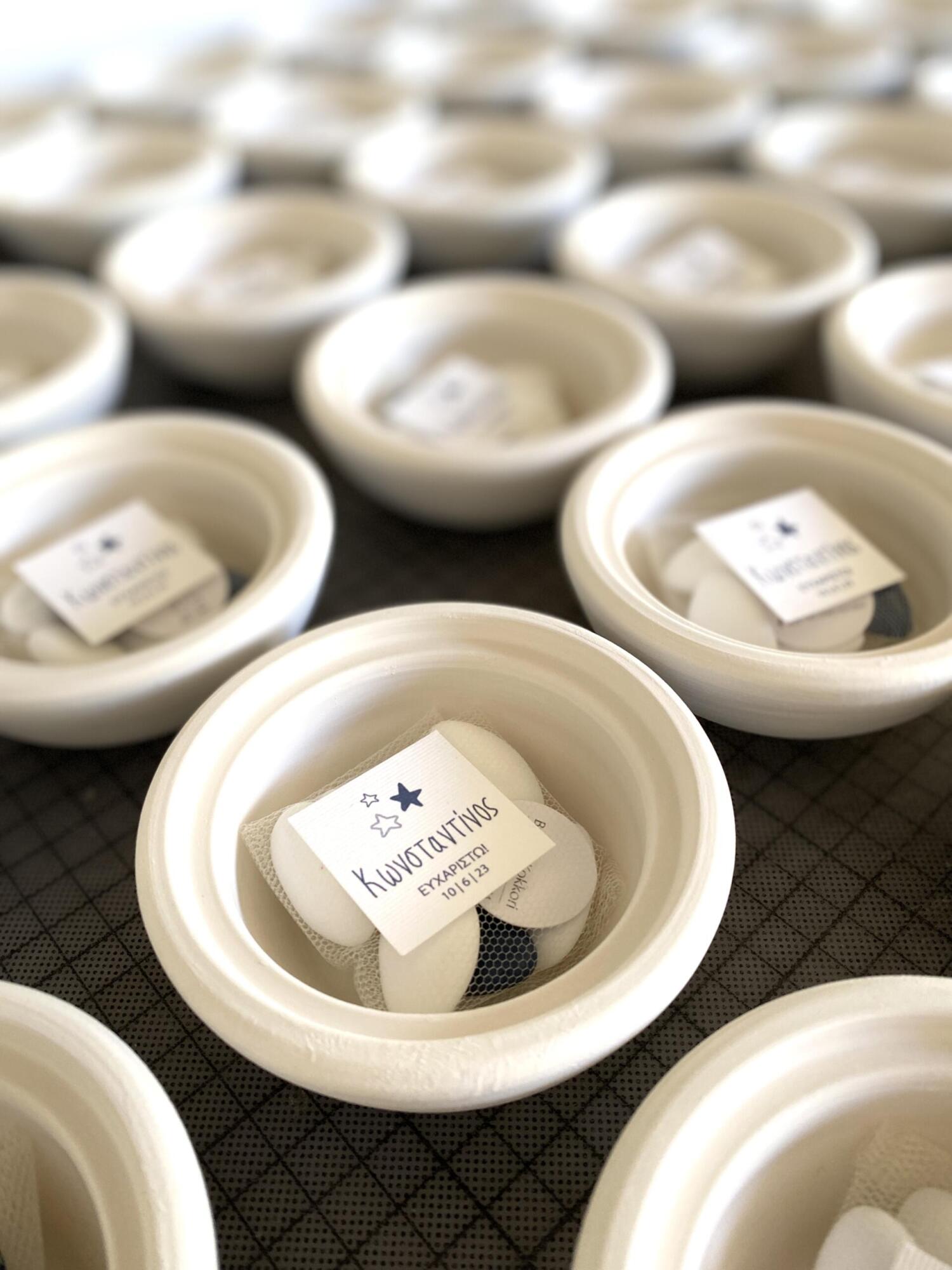 Items featured: Baptism invitation | Thank you cards | Adults’ favors (personalised ceramic bowls) | Baptism set (wooden box, candle and oil set) | Baptism towels, sheet and underwear with embroidered monogram | Witness bracelets | Witness box