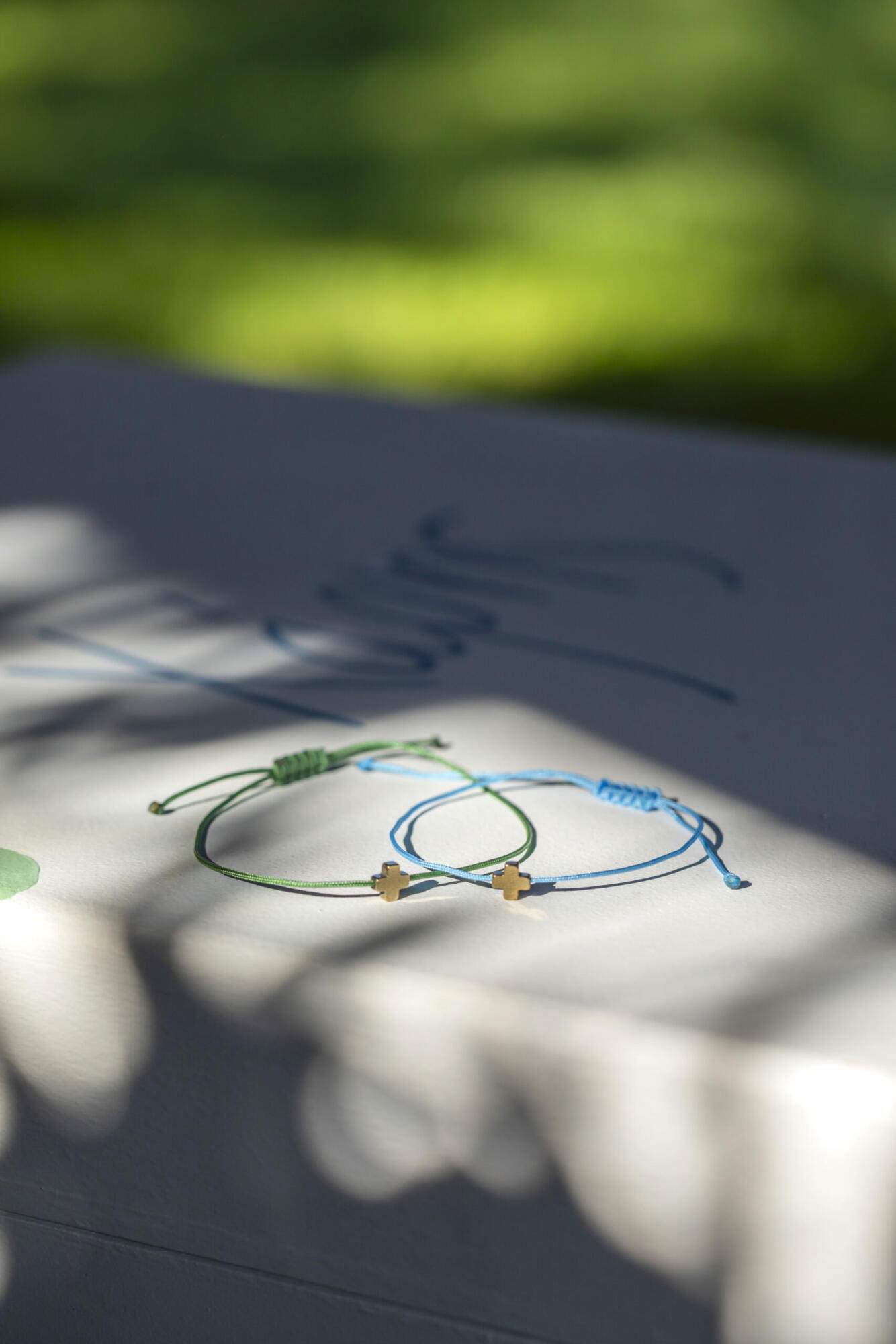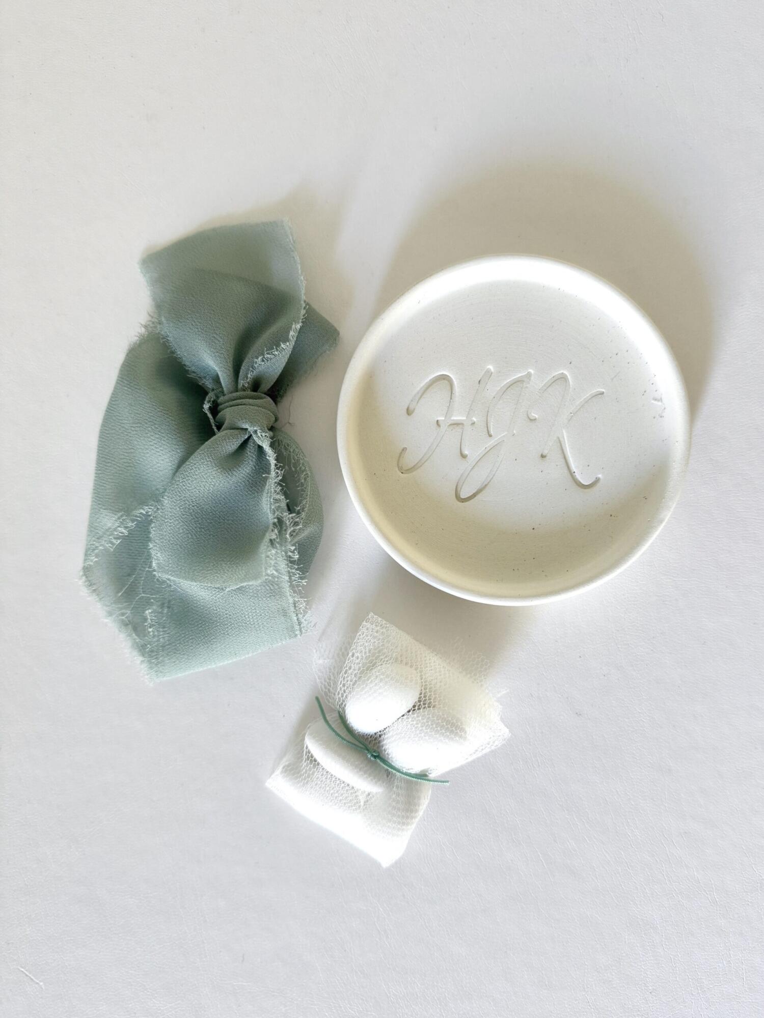 Items featured: Baptism favors (personalized ceramic coasters) | Witness bracelets with macrame closure